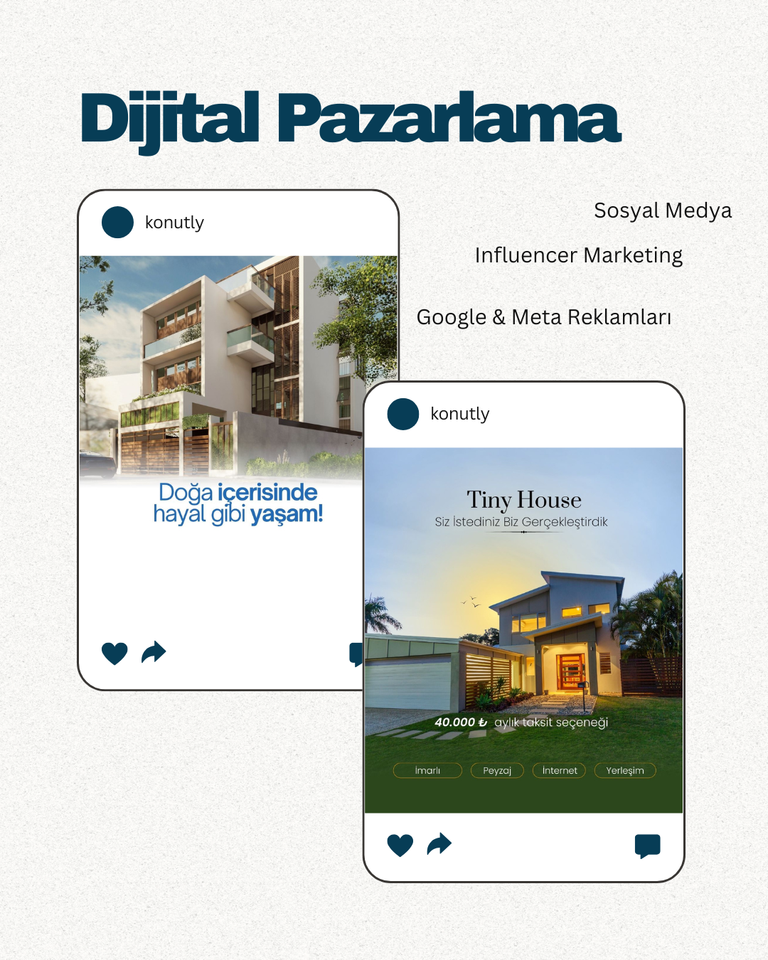 Ajans, konut projelerinde satış odaklı dijital pazarlama yaklaşımıyla hareket eder. Veri analizi, dönüşüm optimizasyonu ve doğru mesajlama sayesinde projelerin daha kısa sürede, daha yüksek verimle satılmasına katkı sağlar. Her projeye özel kurgulanan stratejilerle ölçülebilir ve sürdürülebilir sonuçlar üretir.